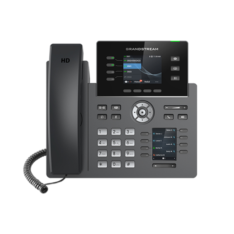 El GRP2614 es un teléfono IP de 4 líneas, con 2 teclas de extensión virtuales y pantalla a color. Está orientado a profesionales multitarea que requieren manejar varias llamadas en simultáneo con eficiencia.
